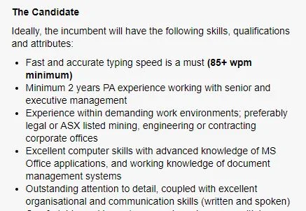 - Exceptional communication skills: As PA to the CEO of an ASX listed company in Perth, I have proven written and verbal communication skills. Often, I had the responsibility of communicating on behalf of the CEO to ensure the smooth delivery of information to interested parties